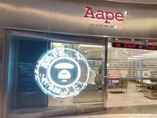 Aape是香港I.T集團的知名日系街頭潮牌,智彩科技為廣州天環(huán)廣場Aape門店量身定制透明led顯示屏。